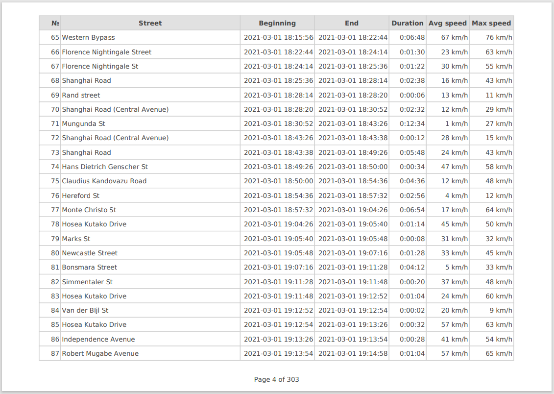 Trip history reports displays the locations visited by the vehicle and the duration spent at each location.